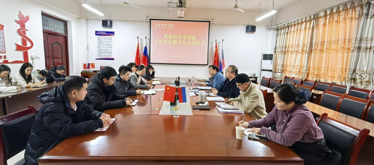 2025年1月20日,莫斯科艺术学院召开本科教育教学审核评估整改任务落实会。学院党总支书记孟波、执行院长殷晓克,全体处科级干部、教学秘书、科研秘书、专业负责人、实验室主任及部分老师参加会议,会议由执行院长殷晓克主持。