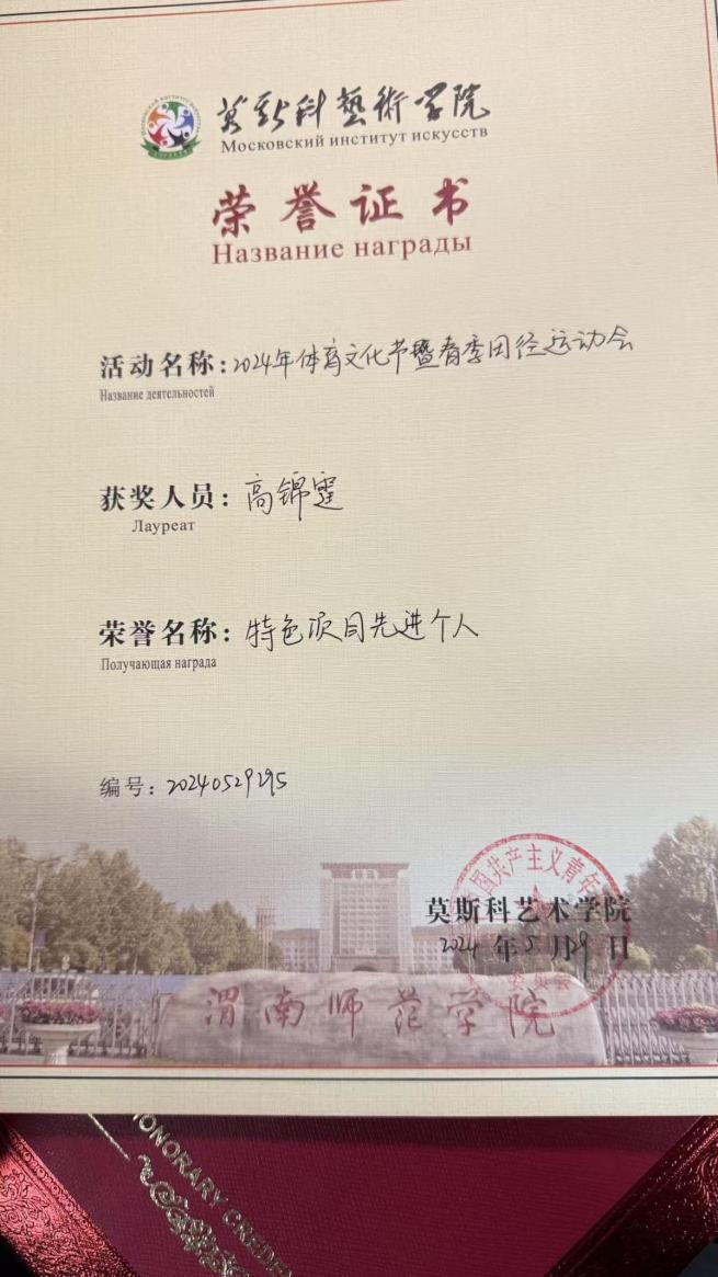 校园活动与实践是我成长的另一块沃土。2024年体育文化节的“特色项目先进个人”,是我参与校园文体活动的收获;暑期社会实践、艺术实践先进个人的荣誉,让我走出课堂,将专业所学与实践结合,在艺术实践中体会创作与表达的真谛;而中俄合作办学高校发展研讨会的“优秀志愿者”经历,更是让我拓宽了视野,在与中外师生的交流中,感受到跨文化沟通的魅力,也更加懂得志愿精神中“奉献、友爱、互助、进步”的内涵。