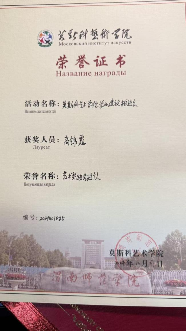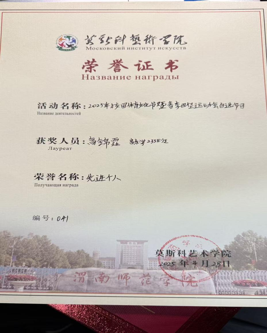 这些荣誉的背后,离不开学院的培养、老师的指导和同学们的支持。莫斯科艺术学院为我们搭建了多元的成长平台,让我有机会在专业学习、学生工作、社会实践等多个维度探索自我。每一次获奖,都不是终点,而是新的起点。