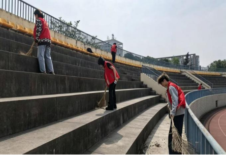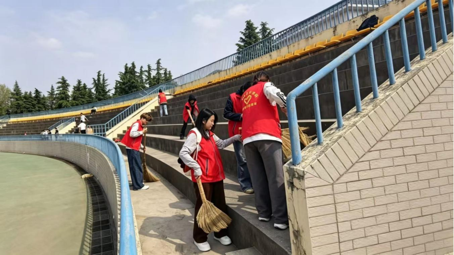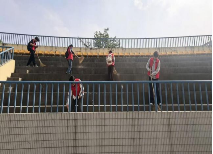在操场看台区域,志愿者们对散落的垃圾、杂物进行清理,净化校园公共环境,为师生观赛营造整洁舒适的空间。