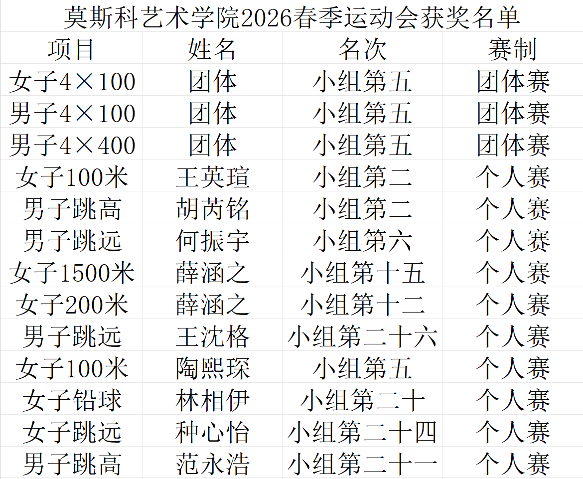 莫斯科艺术学院荣获2026年体育文化节暨春季田径运动会体育道德风尚奖; 莫斯科艺术学院荣获2026年体育文化节暨春季田径运动会女子团体4×100第五名; 莫斯科艺术学院荣获2026年体育文化节暨春季田径运动会男子团体4×100第五名; 莫斯科艺术学院荣获2026年体育文化节暨春季田径运动会男子团体4×400第五名。 彩蛋来啦!背后的我们