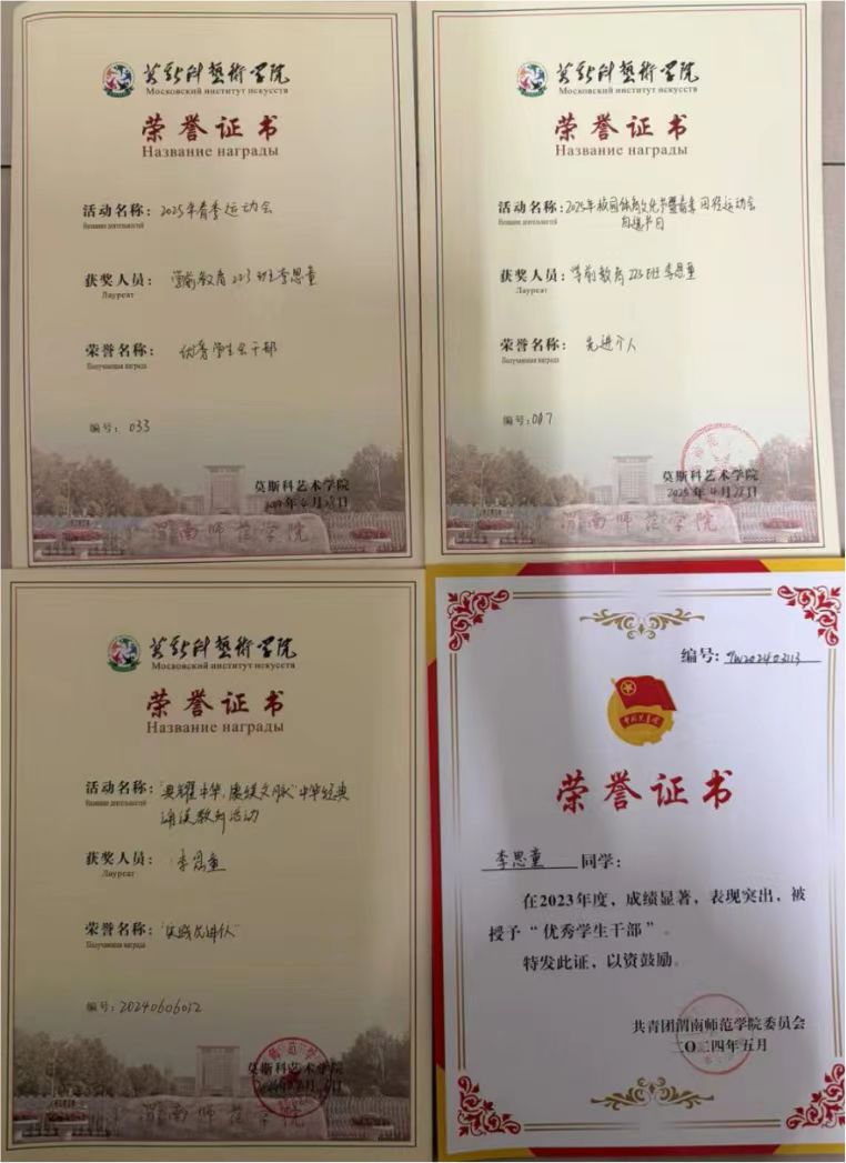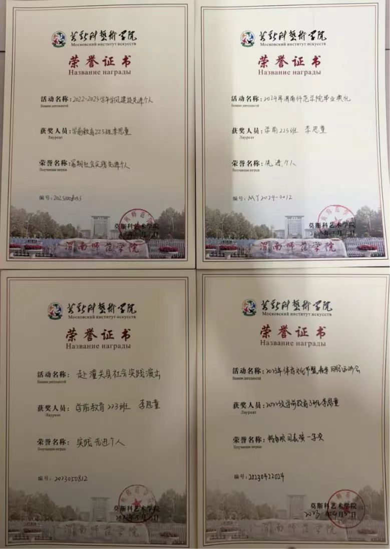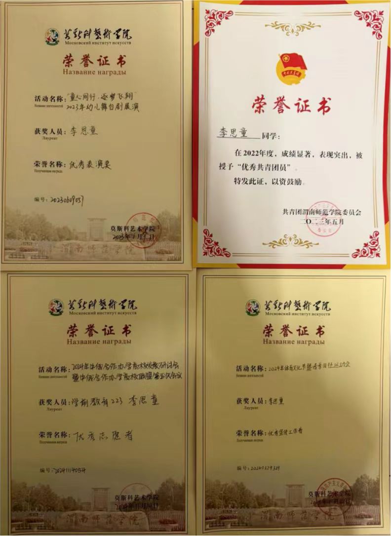 李思童,女,汉族,中共预备党员,莫斯科艺术学院2022级学前教育学学生。曾获五好学生、校级优秀学生干部、优秀共青团员、中俄合作办学高校联盟会议优秀志愿者、渭南师范学院“积极心理 和谐校园”心理健康科普短视频大赛一等奖、“学习二十大,律动绽芳华”第十五届校园文化艺术节舞蹈大赛二等奖、暑期社会实践先进个人、艺术实践先进个人。参与志愿服务实践时长累计300余学时。