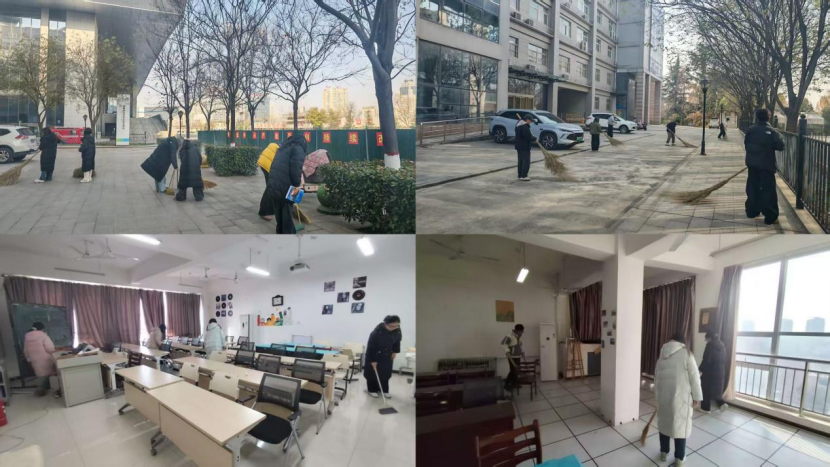 学院师生针对绿化带、道路旁堆积的落叶、杂草等卫生死角进行彻底清扫,同时也对教室、画室等区域的地面颜料残痕、黑板窗台、桌斗卫生、桌椅摆放等细节再做了一次全面细致的清洁整理。大家用实际行动为迎接师范专业认证专家进校考察工作贡献力量,营造一个干净、整洁、美丽的校园。