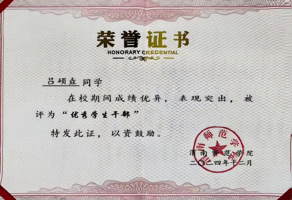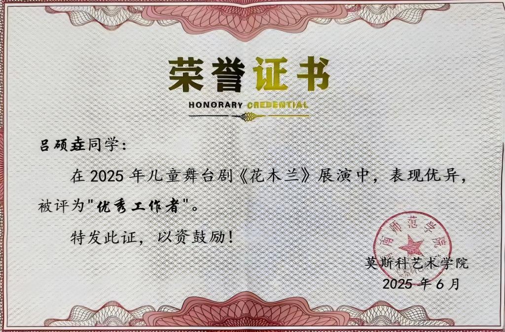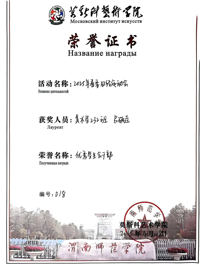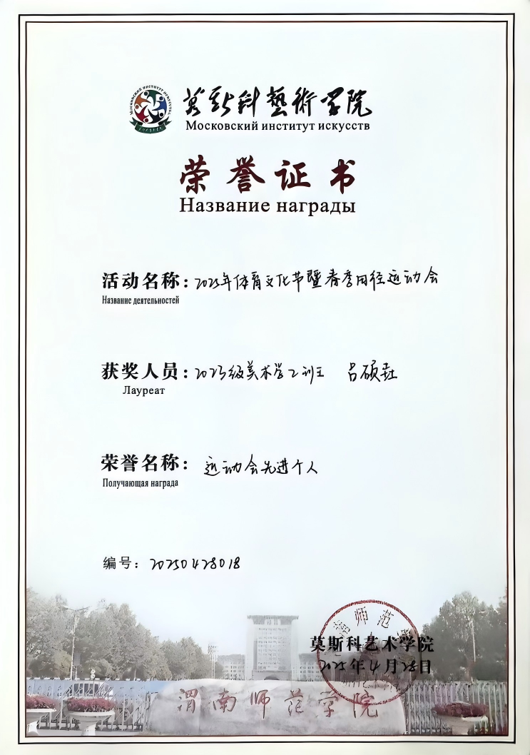 吕硕垚,男,汉族,莫斯科艺术学院2023级美术学学生。曾获得校级优秀学生干部、军训先进个人、“庆祝中华人民共和国成立75周年暨陕西省五四青年节高校师生艺术作品展”三等奖、优秀学生会干部、运动会先进个人、暑期社会实践先进个人等称号。