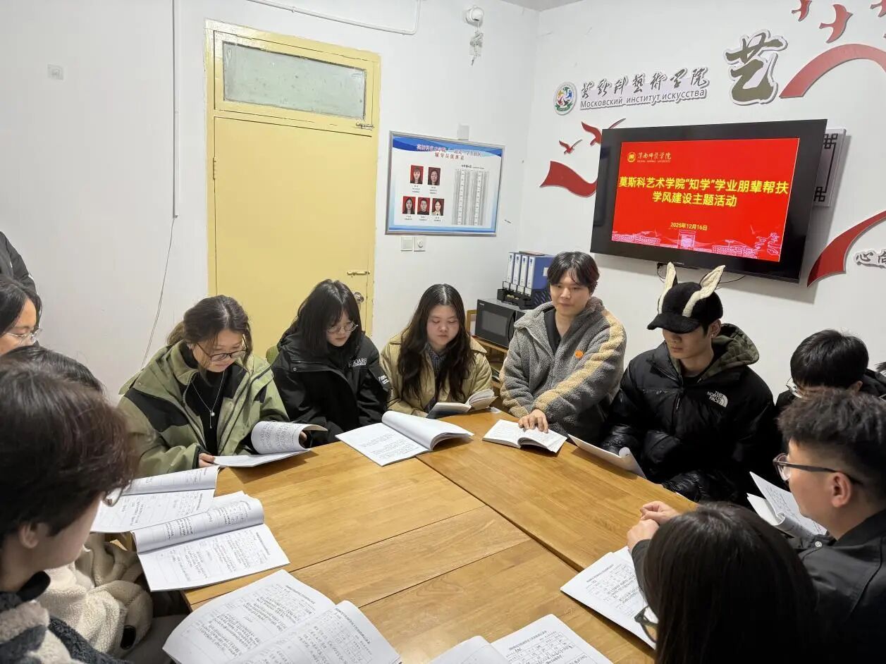 12 月 16 日,莫斯科艺术学院在一站式辅导员工作站开展 “知学” 学业朋辈帮扶学风建设主题活动。邀请24级学业成绩优异学生代表李杰、刘博翔与参会学生分享学习经验与心得。