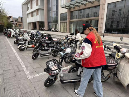 规范车辆停放,维护校园秩序。志愿者们前往教学楼周边电动车停车区域,开展车辆规范整理志愿服务。针对乱停乱放、倾倒歪斜等问题,按划定区域有序摆放,并对停车区进行规整规划。经过志愿者们的努力,停车区域整齐规范、秩序井然,便利师生出行,规范校园交通秩序,传递文明停车新风尚。