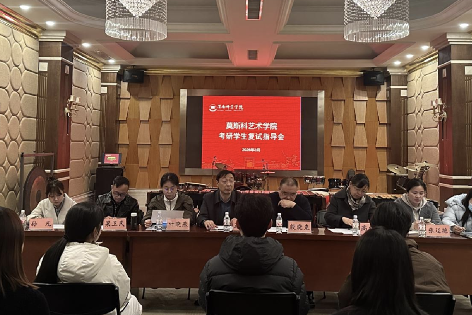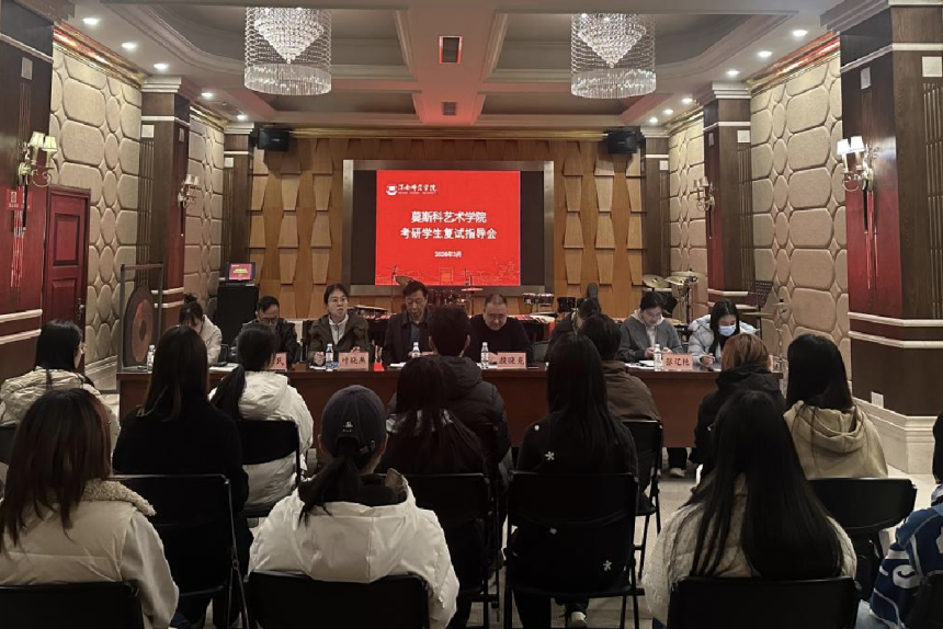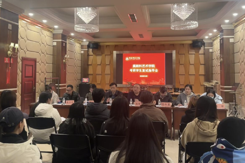 3月9日,莫斯科艺术学院在逸夫楼S112教室召开2026届考研学生复试指导会,为学院15名考研初试过线同学开展复试专项指导。学院党总支书记孟波、院长殷晓克、副书记叶晓燕,副院长梁卫民、高红菊、张辽艳及各专业负责人、毕业班辅导员参加活动。