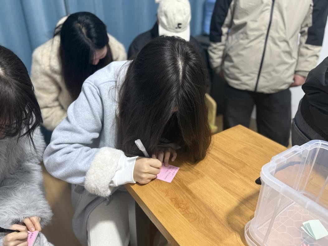 活动现场,同学们围绕专业学习、技能提升、职业规划等核心话题展开热烈交流后,纷纷拿起纸笔认真梳理规划:有的详细写下本学期“教资备考准备”“俄语等级考试冲刺”等具体目标,有的针对性记录上学期暴露出的专业技法薄弱、理论知识不扎实等问题及改进方式。大家将写满规划与反思的纸张仔细折叠,逐一投入专属“目标寄存箱”中。这些封存的“成长约定”将在期末前启封,供同学们对照复盘,检验计划完成情况,促进目标落地。 本次活动